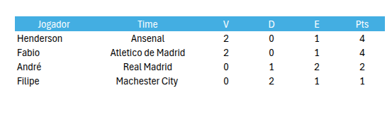 Confira como ficou a tabela de desempenho dos jogadores após os confrontos de hoje: